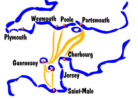 Les ports reliés sont Saint-Malo et Cherbourg pour la France, et Poole, Weymouth et Portsmouth por l'Angleterre. Ce service est assuré par des ferries rapides. |