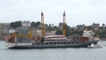 Delivery in front of Dinard of the Compagnie Corsaire brand new passenger vessel, the Jacques Cartier. It comes directly from Australia on deck of the cargoship Annemieke |